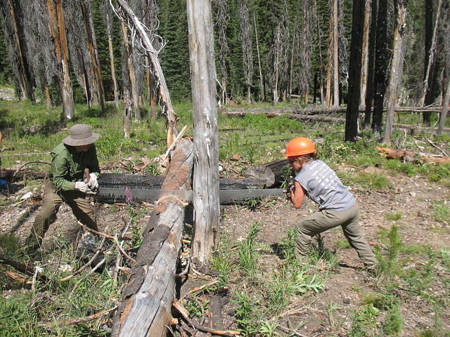 Under the long-time supervision of Liese Dean, Wilderness Program Coordinator, and Deb Peters, Assistant Trails Supervisor and expert packer, we backpacked in five miles to a campsite in the Stanley Creek area of the wilderness and immediately got familiar with our home for the week. Our first impressions were how incredibly clean the water flowed through this magnificent granite-based, Lodgepole pine forest — some of the clearest water we had ever seen. And we couldn’t help but be starkly reminded that the entire location, camp and work sites, were in a burned area from a 2007 fire.